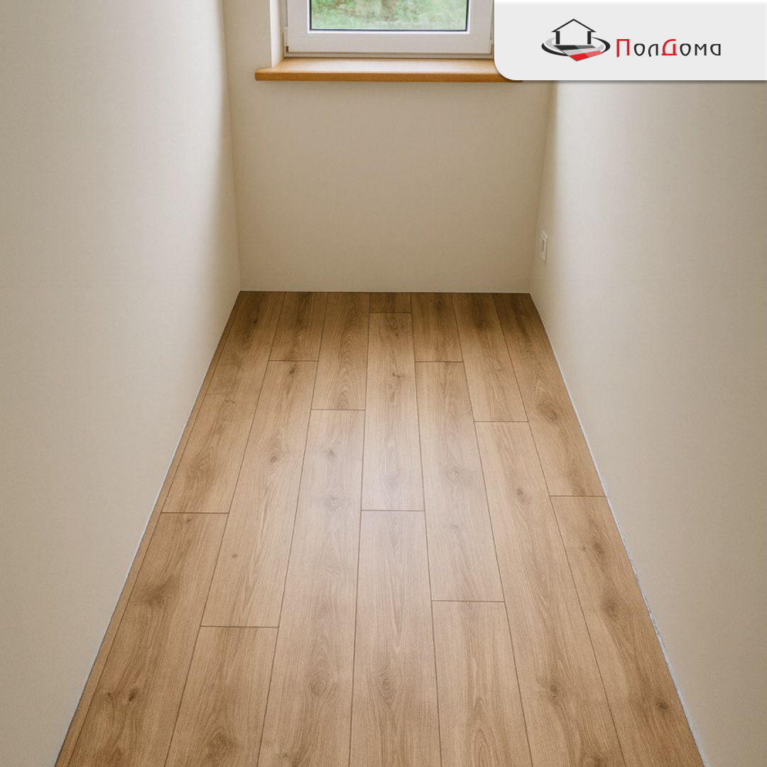 Дом получил современный, тёплый и износостойкий пол под натуральный дуб. Покрытие визуально объединяет помещения, легко моется и готово к ежедневной эксплуатации семьи и гостей.